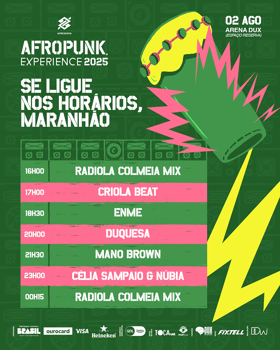 O evento celebra a música preta em suas múltiplas vertentes e reúne nomes que transitam entre o reggae, o rap e outras sonoridades: Mano Brown, Duquesa, ENME, Criola Beat, Célia Sampaio e Núbia. Apresentado pelo Banco do Brasil (BB), o AFROPUNK Experience Maranhão tem últimos ingressos disponíveis (acesse aqui).